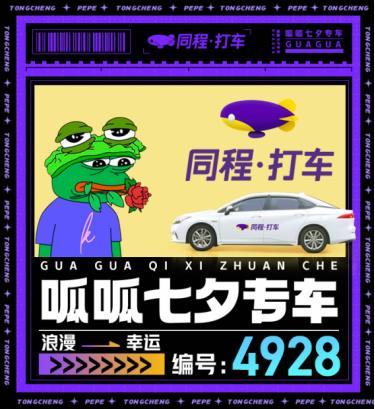 本次活动中,同程打车结合七夕活动“越浪漫越幸运”的主题,与“悲伤蛙Pepe#4928”形象联名合作,推出七夕限量数字藏品“呱呱专车”。该款藏品寓意呱呱搭乘同程专车送惊喜,愿这个七夕只有浪漫和幸运,没有悲伤。用户参与同程打车七夕抽奖活动即有机会获得该款数字藏品。