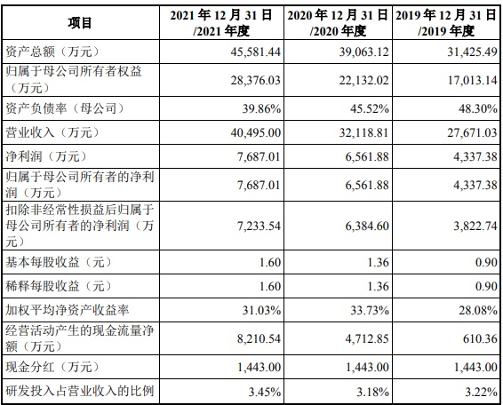 财务方面,于2019年度、2020年度及2021年度,远翔新材营业收入分别约为2.77亿元、3.21亿元、4.05亿元人民币。公司净利润分别为4337.38万元、6561.88万元、7687.01万元人民币,归母净利润与净利润数值相同。