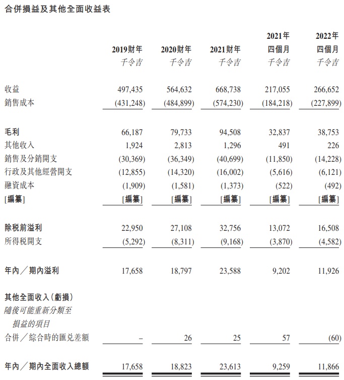 于2019财年、2020财年、2021财年及2022年截至4月30日止四个月,双财庄收益分别约为4.97亿令吉、5.65亿令吉、6.69亿令吉及2.67亿令吉。同期,公司期内利润分别约为1765.8万令吉、1879.7万令吉、2358.8万令吉及1192.6万令吉。