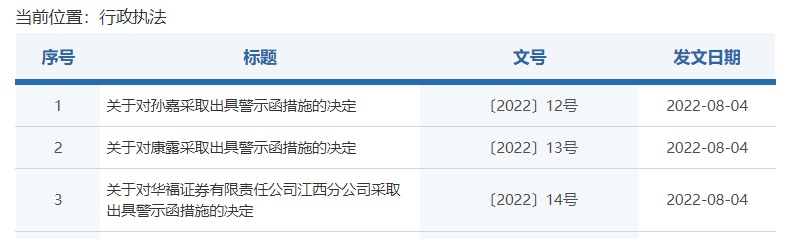 因此,江西证监局向当事人康露、时任江西分公司负责人孙嘉,以及华福证券江西分公司开具警示函。