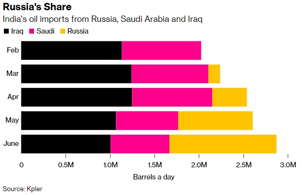 值得一提的是,2021年,沙特是印度的第二大供应商,而俄罗斯是第九大供应商,伊拉克是印度最大的原油供应国,并一直保持到今年6月。要知道,在2月底俄乌冲突升级之前,印度的大部分月供应量应该是固定的。但自3月以来,印度从俄罗斯的进口激增了10倍。