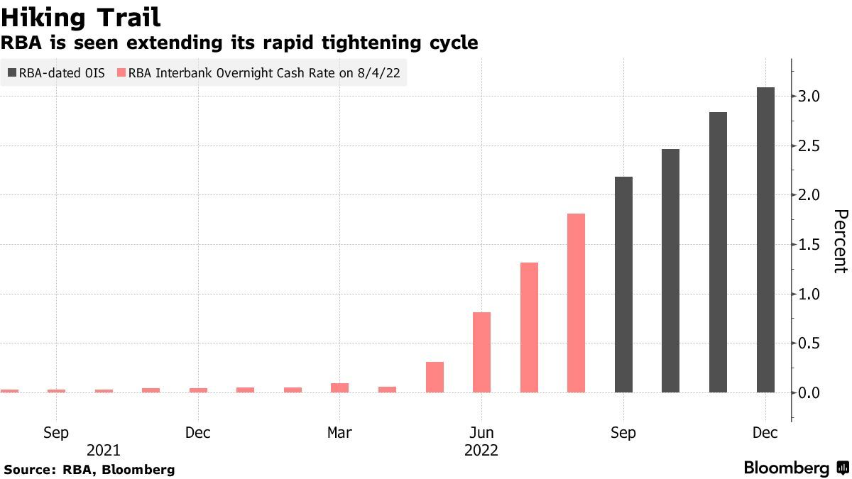 经济学家预计,澳联储将在9月份再次加息50个基点至2.35%,这将是1994年以来最快加息速度。5月份加息周期开始时,现金利率仅为0.1%。