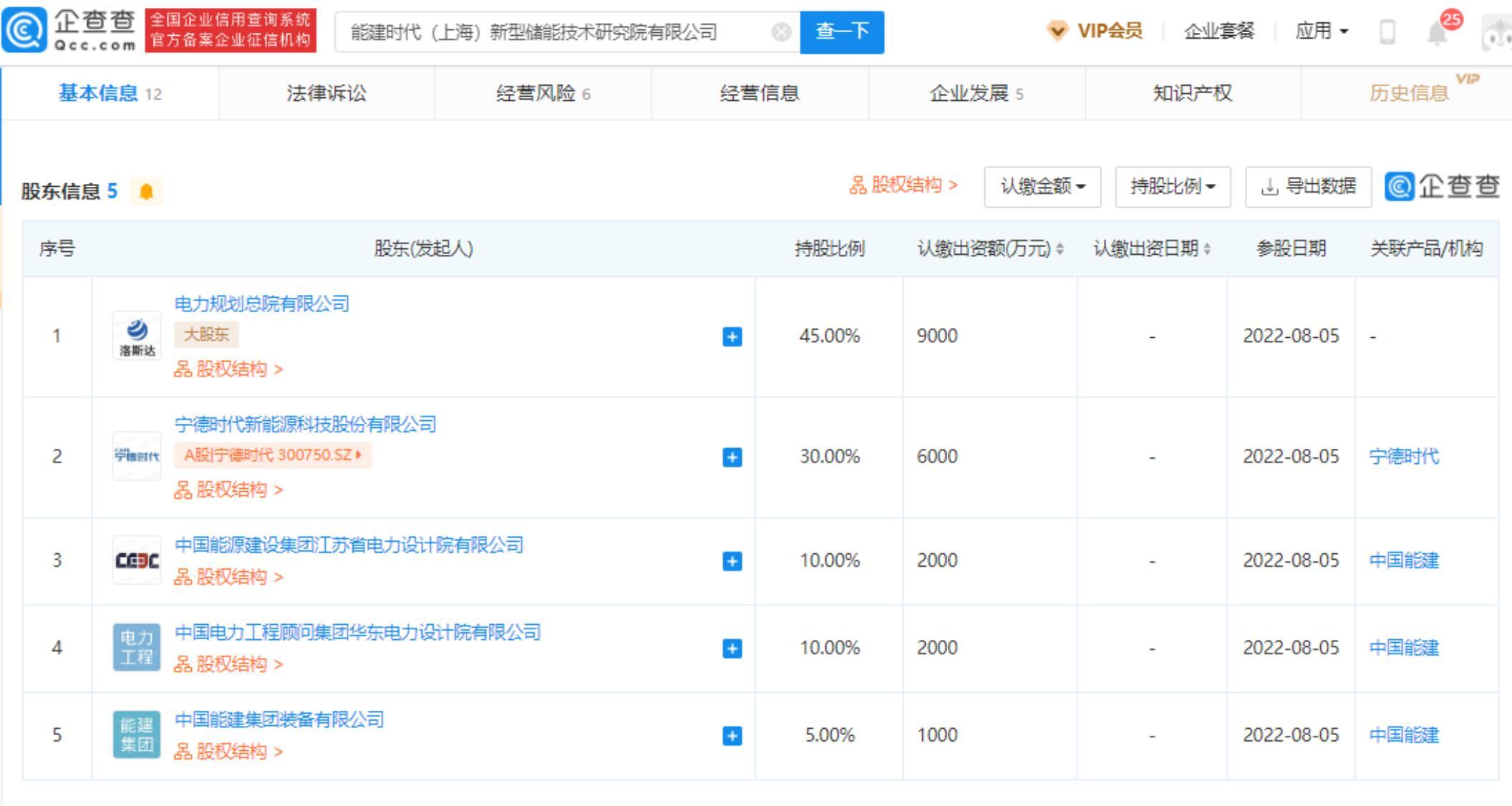 据股东信息显示,该公司由电力规划总院有限公司、宁德时代新能源科技股份有限公司、中国能源建设集团江苏省电力设计院有限公司等共同持股。