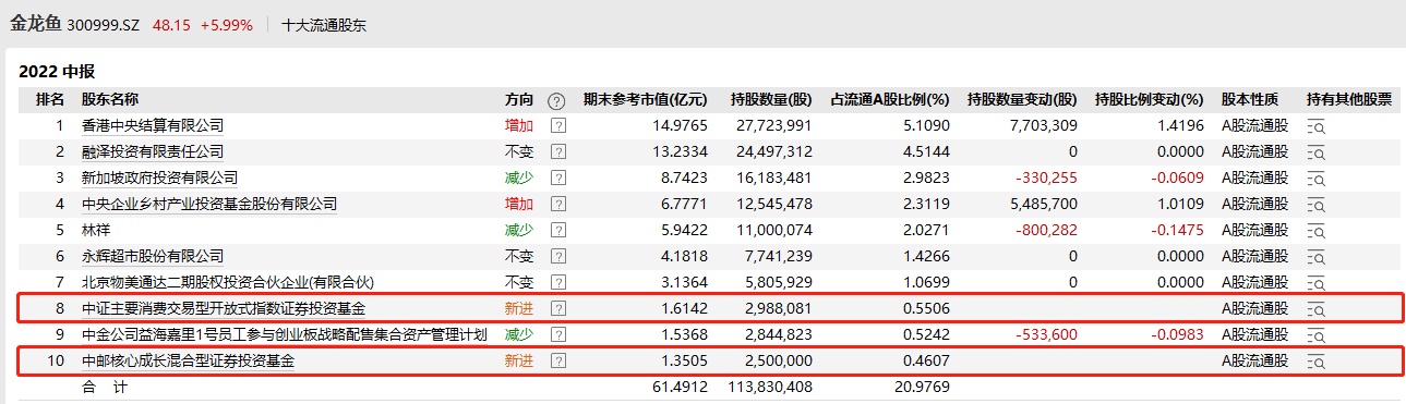 智通财经APP获悉,8月5日,金龙鱼(300999.SZ)的上半年业绩报告中披露了前十大股东最新持股情况。过蓓蓓管理的百亿基——汇添富中证主要消费ETF新晋该股第八大流通股东,王曼、白鹏、陈梁管理的中邮核心成长新晋第十大流通股东。这两只基金分别持股298.81万股、250万股,分别占总流通股本持股比例的0.55%、0.46%。