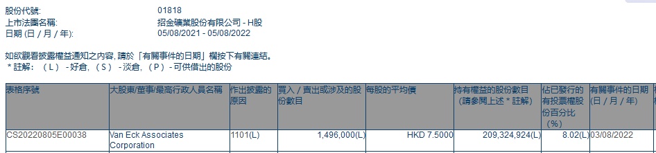 智通财经APP获悉,香港联交所最新资料显示,8月3日,Van Eck Associates Corporation增持招金矿业(01818)149.6万股,每股作价7.5000港元,总金额为1122万港元。增持后最新持股数目约为2.09亿股,最新持股比例为8.02%。