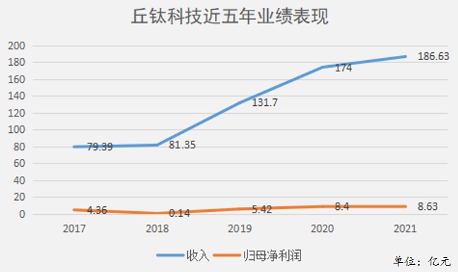 2017-2021年,丘钛科技实现收入79.39亿元、81.35亿元、131.7亿元、174亿元、186.63亿元;同期,公司归母净利润分别为4.36亿元、0.14亿元、5.42亿元、8.4亿元、8.63亿元。