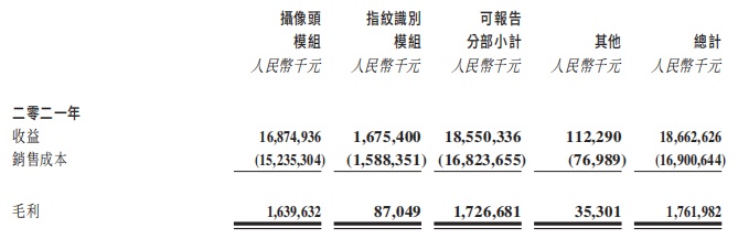 拆分结构,丘钛科技的收入来源于摄像头模组、指纹识别模组和其他板块(拟分拆上市的丘钛微的主营即为丘钛科技的摄像头模组业务)。以2021年为例,摄像头模组依然是公司第一大收入来源,年内该业务实现收入168.75亿元,占比90.42%,规模同比增长了11%;同期,公司的指纹识别模组实现收入16.75亿元,占比8.98%,规模同比下滑了20.3%;其他业务实现收入1.12亿元,占比0.6%,规模同比增长了15.5%。