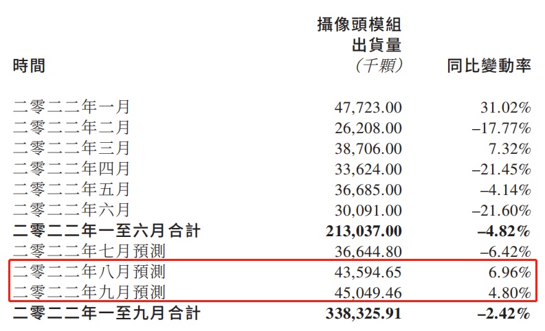 得益于近期经营状况显著回暖,公司方面预计今年前三季摄像头模组出货量同比下滑比率有望收窄至2.42%。