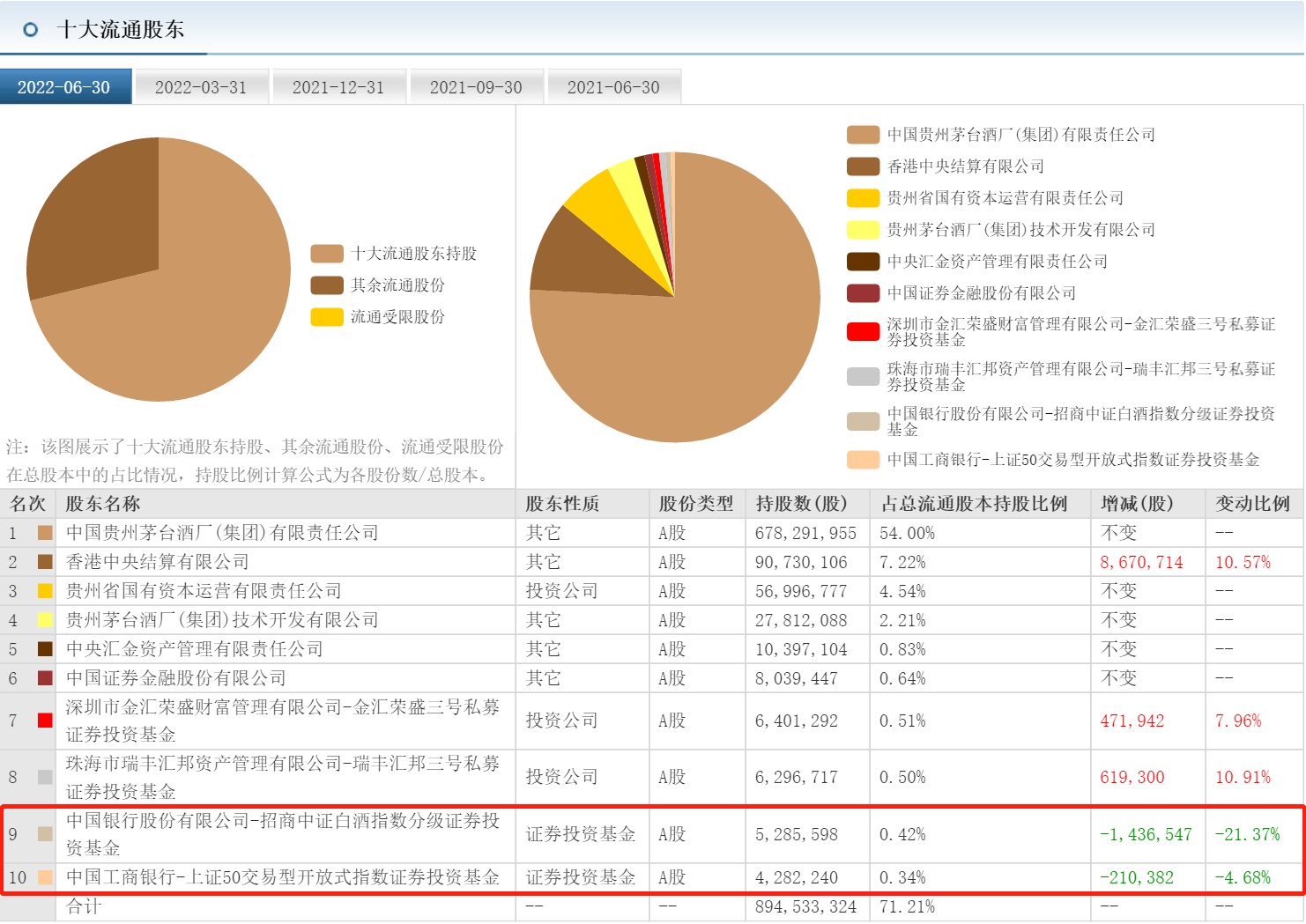 华夏上证50ETF也于二季度减持贵州茅台,减持21.04万股,变动幅度为-4.68%,位列十大流通股东中的第十位。