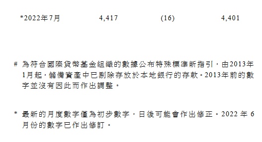 智通财经APP获悉,8月5日,香港金融管理局公布,香港于2022年7月底的官方外汇储备资产为4,417亿美元(2022年6月底为4,472亿美元)。连同未交收外汇合约在内,香港于2022年7月底的外汇储备资产为4,401亿美元(2022年6月底为4,472亿美元)。为数4,417亿美元的外汇储备资产总额,相当于香港流通货币约6倍,或港元货币供应M3约42%。