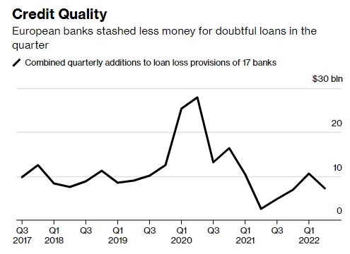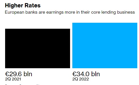欧洲央行11年以来的首次加息预期推动了贷款利润率的上升,促使客户对冲交易头寸,同时贷款账面仍有弹性,这些银行从中受益。然而,随着通胀开始侵蚀公司利润,利率上升使借款人更难偿还债务,以及俄气供应的削减威胁着经济,一些银行警告称,好景可能不会持续。