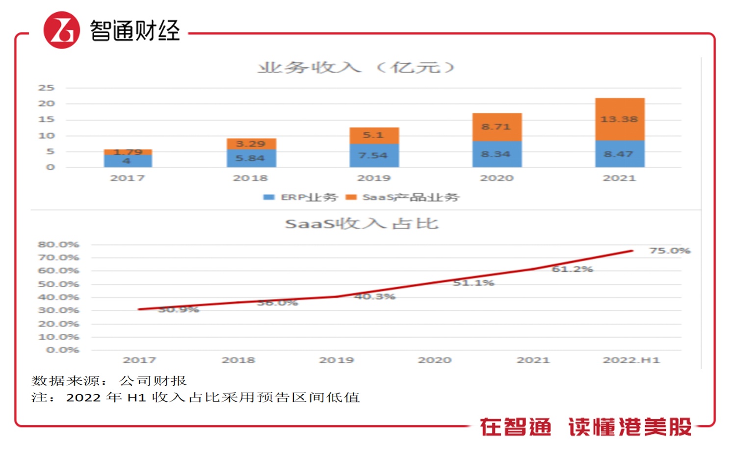ERP解决方案聚焦于企业资源管理,而SaaS产品包括云客、云链以及云空间,在两大业务驱动下,该公司成长性较好,保持双位数的复合增长。2017-2021年,该公司收入复合增速39.3%,其中ERP解决方案及SaaS产品复合增速分别为20.63%及65.35%,SaaS产品收入贡献从2017年的31%提升至2021年的61.26%,根据2022年上半年预告,收入贡献进一步提升至75%。
