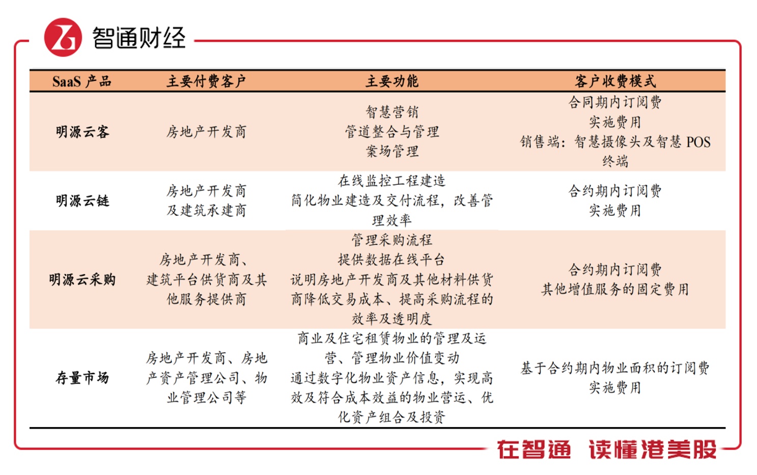 智通财经APP了解到,明源云以物业管理软件起家,为房地产开发商及产业链提供企业级ERP 解决方案及 SaaS 产品,赋能地产数字化转型需求。两大业务主要应用在营销管理、供应链管理、存量管理和企业资源管理四大板块。营销管理载体为云客,供应链管理载体包括云链和云采购;存量管理为云空间,而企业资源管理为云ERP。