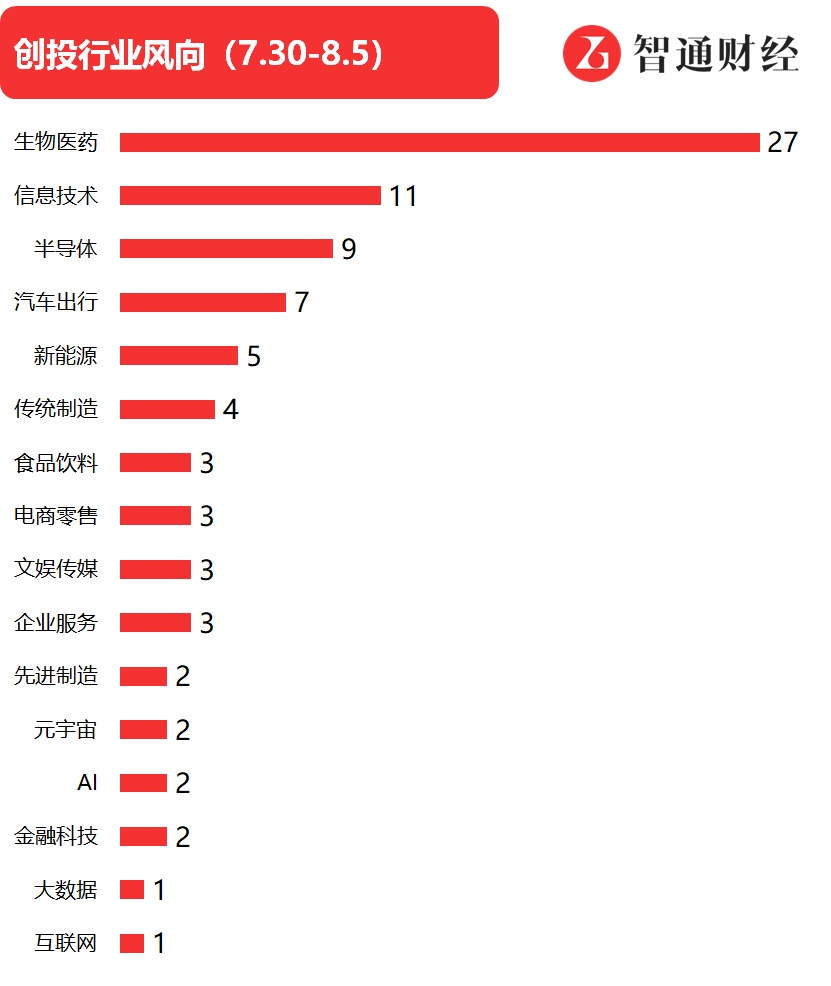 据智通财经统计,本周创投事件合计85起,环比上周上升4%。从赛道上看,医药及科技类仍为投资热门方向,本周生物医药、信息技术领域成功融资的项目数量最多,分别达27个、11个。从融资轮次上看,投资者对前期及中期项目更为关注,周内项目投资集中于A/A+轮及B/B+轮,分别达到24个和16个。