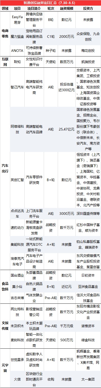 泛消费领域,汽车板块现百亿元级投后估值,酱酒、自热火锅品牌获亿元级融资。本周,高端智能纯电汽车研发商智己汽车完成A轮股权融资协议签署,在首轮市场化融资顺利完成后,智己汽车投后估值将达到近300亿元。高端智能电动汽车品牌阿维塔科技完成A轮增资,整体融资规模近50亿元,投后估值近百亿。另外,食品饮料赛道再迎亿元级投融资事件,头部酱酒品牌国台酒业获数亿元战略投资、自热火锅品牌莫小仙完成近亿元B+轮融资。
