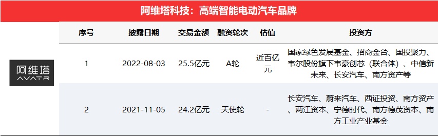 2、阿维塔科技:本周宣布已完成A轮融资。本轮增资由国家绿色发展基金股份有限公司领投,招商金台、国投聚力、韦尔股份旗下韦豪创芯(联合体)、中信新未来等多家投资机构隐现增资名单。阿维塔科技现有股东长安汽车和南方资产等也进一步追加投资。增资同时,阿维塔科技还将与本轮新加入的多家增资方,就销售网络支持、芯片保供和视觉图像感知、智能座舱开发等签署长期战略合作协议,进一步强化产业链资源优势。