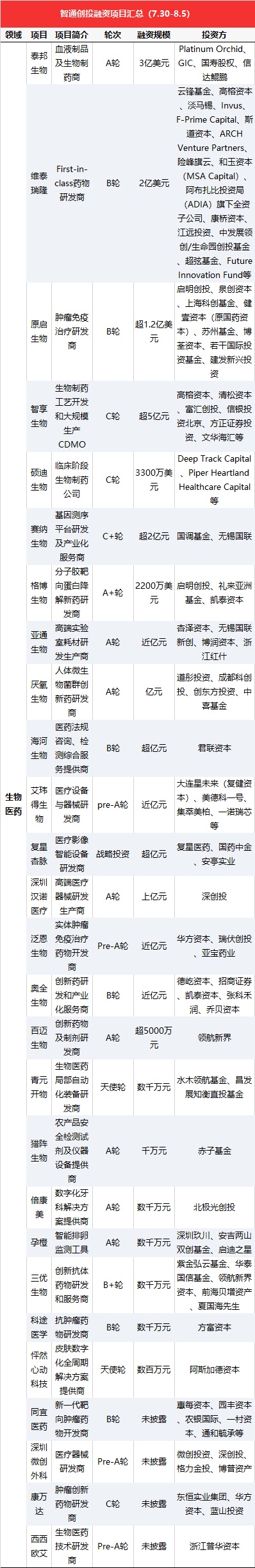 大健康领域,15家企业完成亿元级融资。本周,血液制品及生物制药商泰邦生物、First-in-class药物研发商维泰瑞隆、肿瘤免疫治疗研发商原启生物3家公司均完成了1亿美元以上的融资,另外生物制药工艺开发和大规模生产CDMO智享生物、临床阶段生物制药公司硕迪生物等12家公司完成亿元级投融资。生物医药领域融资事件数量领先,融资规模也相对较大,涉及投资者国际化程度较高。