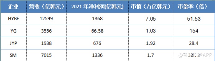 从以上可以看出,考虑到明星知名度、公司成长性等因素,韩国四大娱乐公司的估值体系亦不相同,最高的YG娱乐达到154倍,HYBE达到51.53倍,而最低的SM则仅有12.72倍。