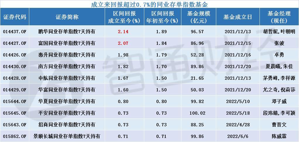 成立来回报超过2%的还有富国同业存单指数7天持有,该基金规模为86.96亿元,成立来回报为2.07%。