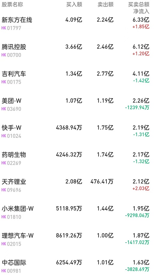 新东方在线(01797)获净买入1.85亿港元。消息面上,针对市场流传的抖音电商对东方甄选进行限流的传闻。公司回应中证报记者称,没有接到抖音限流通知,目前,公司在大力发展自营产品,相关内容会在接下来的财报里披露。抖音电商相关负责人则表示:“不存在对东方甄选限流的情况,东方甄选是抖音电商优质生态中的一个代表性商家,抖音电商鼓励类似优质直播间在平台持续经营与发展。”