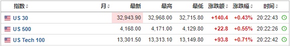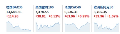 2. 截至发稿,德国DAX指数涨0.85%,英国富时100指数涨0.52%,法国CAC40指数涨0.99%,欧洲斯托克50指数涨1.07%。