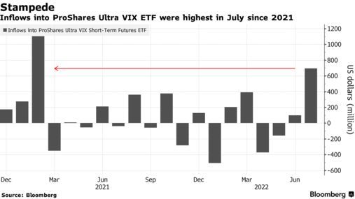 市值13亿美元的ProShares Ultra VIX短期期货(UVXY)ETF上个月获得了2021年2月以来的最大资金流入。当波动性骤升时,该ETF将获利。Susquehanna International Group衍生品策略师Chris Murphy表示,资金流入UVXY的可能原因是买家将关注点从强劲的美股盈利转向令人不安的经济趋势,正在寻求对冲。