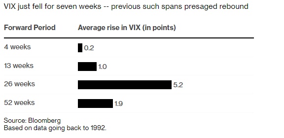 截至8月5日,VIX指数连续七周下跌。一份可追溯到1992年的数据分析表明,这种情况在之前已经出现了七次。根据彭博汇编的数据,VIX指数上涨5个多点,标普500指数将在26周后平均上涨0.6%。