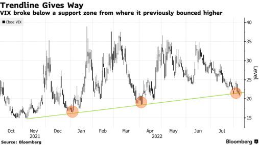 智通财经APP获悉,衡量标普500指数隐含股票波动率的VIX指数(恐慌指数)可能即将考验美股从6月低点以来13%的涨幅是否可持续。