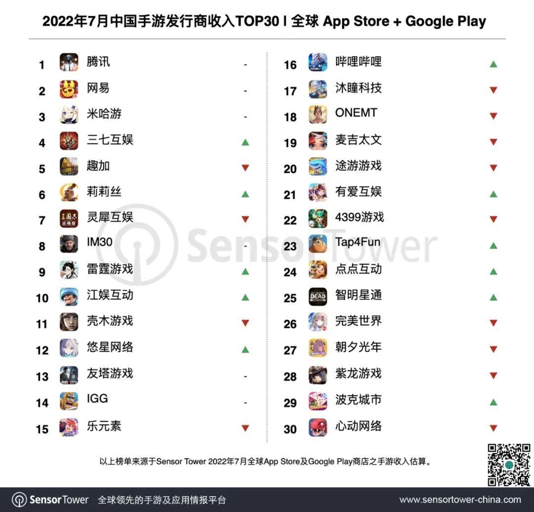 7月英雄游戏发行的《战双帕弥什》在中文、日韩和英文版本分别举行了夏日活动和一周年庆典,游戏全球收入环比激增179%,发行商收入相应增长42.4%,位列全球手游发行商收入排行榜第84名。