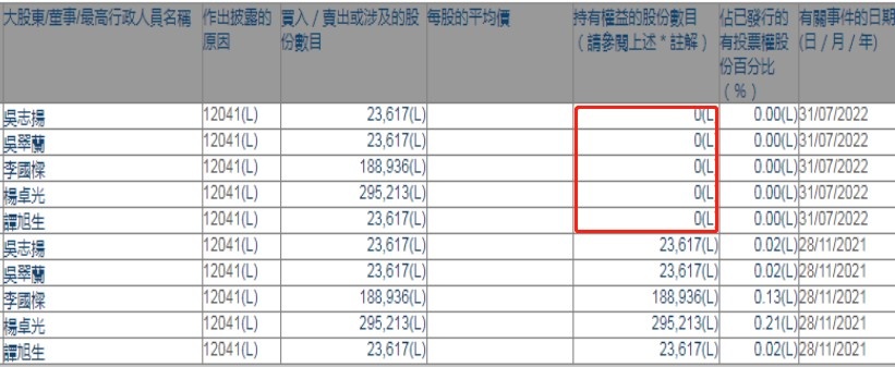 此外,根据港交所的披露,截至7月31日,杨卓光、李国梁、谭旭生、吴志扬、吴翠兰名下的股票已经出完(见下图)。而这几人分别是该公司的行政总裁、执行董事以及三位独立非执行董事。