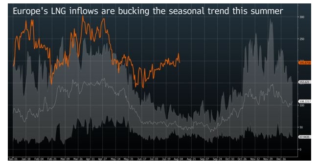 欧洲大陆目前的天然气储存库已满72%,而前五年的平均储存量为70.1%。