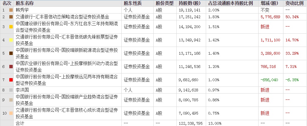 2021年末有八只基金位列其前十大流通股东席位,陆彬、李竞、施成、杜猛均投入不小。陆彬管理的汇丰晋信动态策略、汇丰晋信低碳先锋、汇丰晋信核心成长,李竞管理的东方红启东三年持有,施成管理的国投瑞银新能源、国投瑞银产业趋势,杜猛管理的上投摩根新兴动力、上投摩根远见两年持有上榜前十。