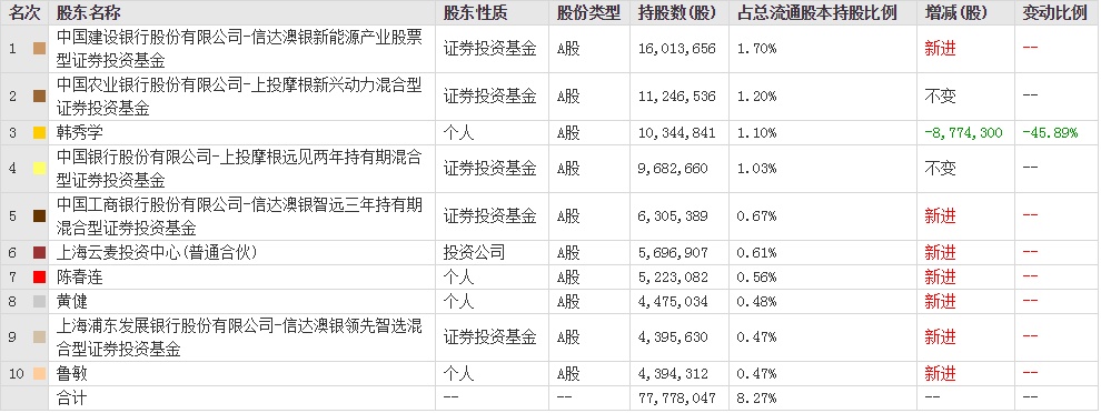 2022年一季度,陆彬、李竞、施成均退出前十席位。冯明远在该季度大幅加仓,他所管的信澳新能源产业、信澳智远三年、信澳领先智选新晋前十大流通股东。报告期内,杜猛所管的2只基金持股数不变,但其持股数排名有所增加。