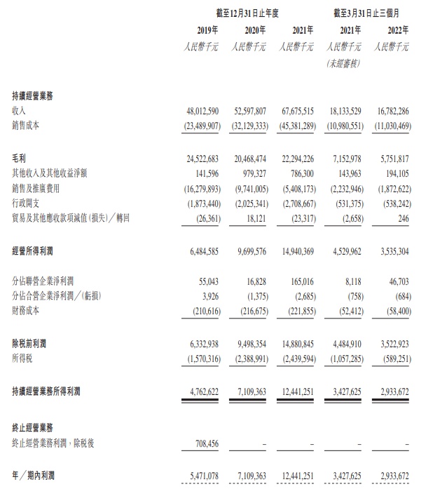财务方面,于2019年、2020年、2021年度,及2021年、2022年度截至3月31日止三个月,公司收入分别约为480.13亿元、525.98亿元、676.76亿元、181.34亿元及167.82亿元。于2019年、2020年、2021年度,及2021年、2022年度截至3月31日止三个月,公司净利润分别约为54.71亿元、71.09亿元、124.41亿元、34.28亿元及29.34亿元。