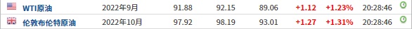 3. 截至发稿,WTI原油涨1.23%,报91.88美元/桶。布伦特原油涨1.31%,报97.92美元/桶。