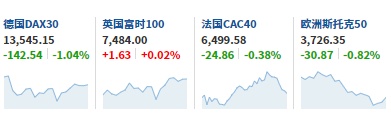 2. 截至发稿,德国DAX指数跌1.04%,英国富时100指数涨0.02%,法国CAC40指数跌0.38%,欧洲斯托克50指数跌0.82%。