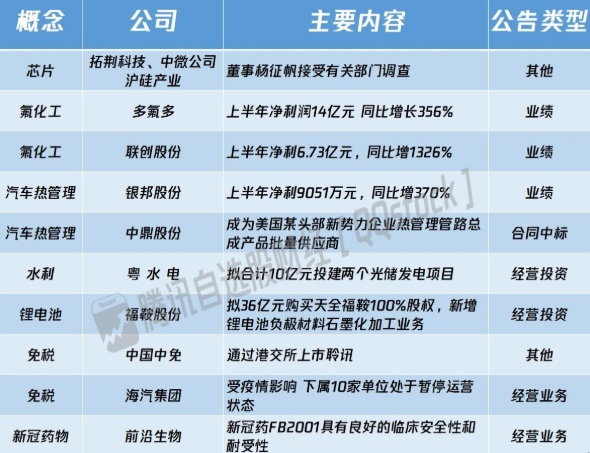 今日晚间《公告精选》的主要内容有:①中微公司、拓荆科技:董事杨征帆接受有关部门调查;②中国中免:通过港交所上市聆讯;③多氟多上半年净利润14亿元,同比增长356%。