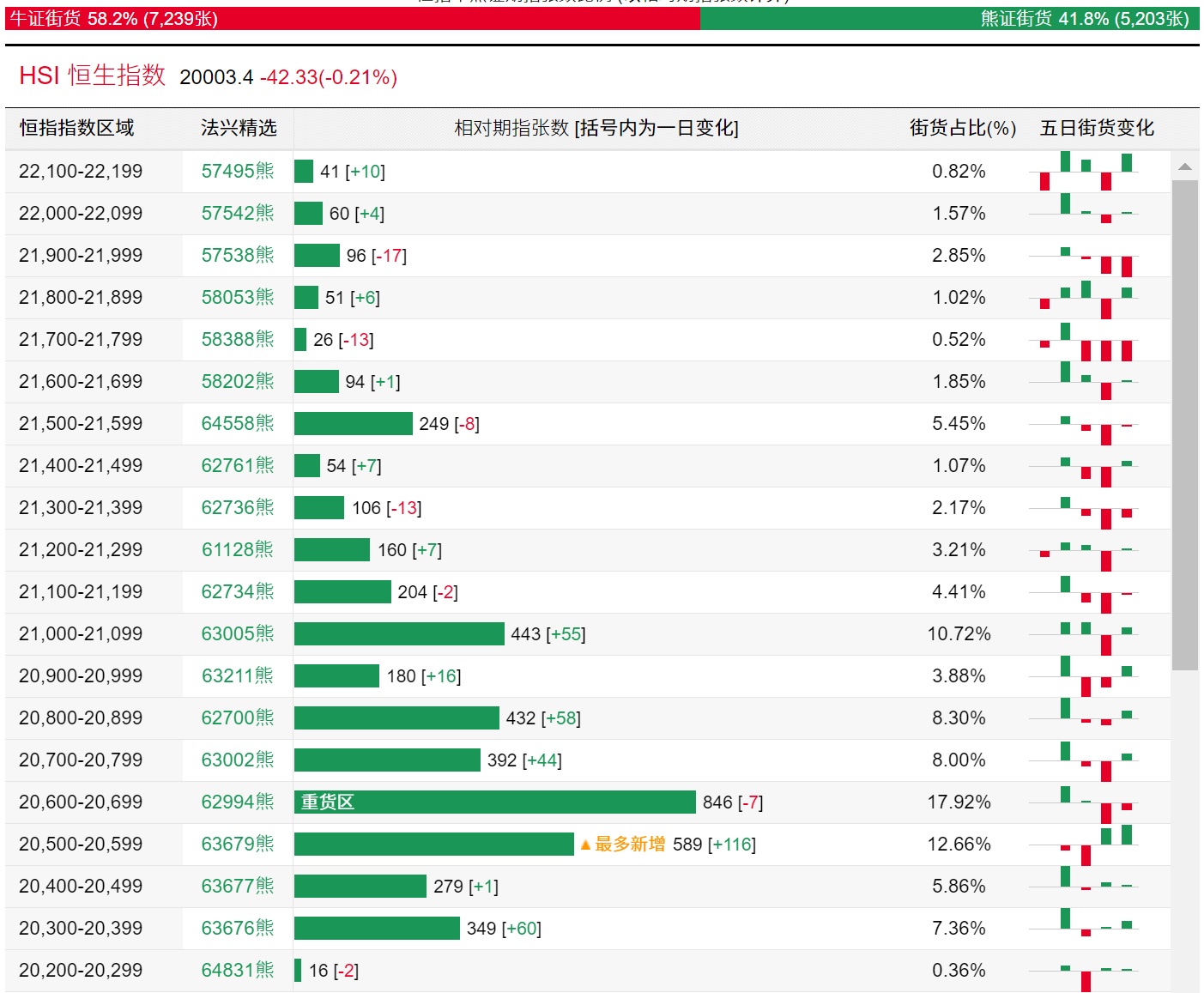 法兴恒指牛熊证街货分布图中的数据显示,熊证街货重货区在20600-20699区间,该区间最新熊证数量为846张,较上一交易日减少7张;最多新增在20500-20599区间,该区间最新熊证数量为589张,较上一交易日增加116张。