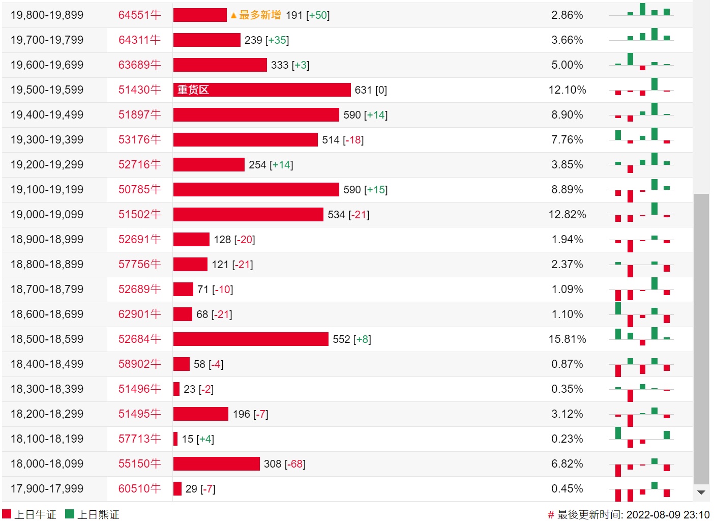 牛证街货重货区在19500-19599区间,该区间最新牛证数量为631张,较上一交易日增加0张;最多新增在19800-19899区间,该区间最新牛证数量为191张,较上一交易日增加50张。