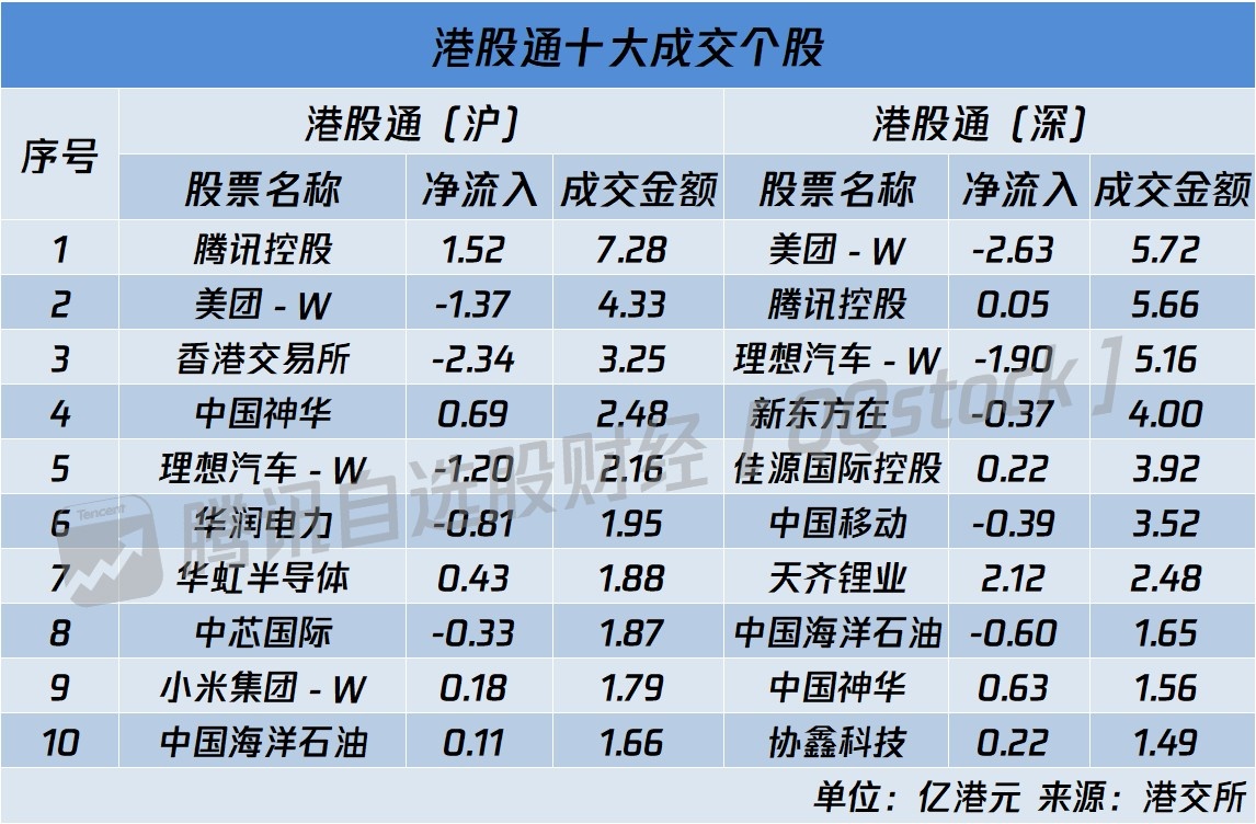 南向资金昨日净流出5.97亿港元。港股通(沪)方面,香港交易所净卖出2.34亿港元,美团-W净卖出1.37亿港元。港股通(深)方面,美团-W净卖出2.63亿港元,理想汽车-W净卖出1.90亿港元。