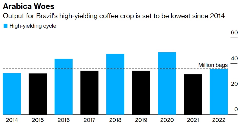 巴西的干旱和寒冷抑制了上一季的植物开花,以及2021年7月的严重霜冻,导致农民在农业投入(尤其是化肥)成本高的时候砍伐了咖啡树。这不仅削减了去年的收成,还抑制了2022年的潜力,而2022年本应是巴西收成的高产周期。