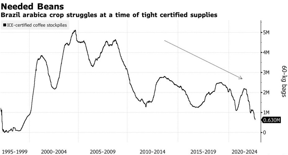 因此,今年需要更多的豆子来填满咖啡袋。Ricco表示,生产一袋60公斤的豆子通常需要420升豆子,而收成报告显示,现在平均需要570升豆子。根据Ricco的数据,巴西今年的袋产量可能仅为3200万袋,低于3月份预估的3800万袋,也远低于高产量周期约5300万袋的潜在产量。
