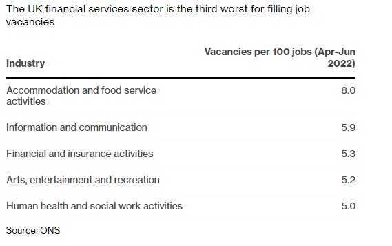 智通财经APP获悉,英国金融公司正在努力应对2001年有记录以来最糟糕的职位空缺率,突显出银行、投资和保险等领域走向数字化导致的技能短缺。根据英国国家统计局汇编的数据,在2022年4月至6月,英国金融行业每100个岗位中就有5个以上的职位空缺,仅低于酒店和科技行业。