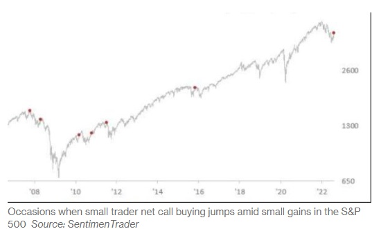 智通财经APP获悉,散户投资者再度涌入期权市场,这在历史上一直是股市的不祥之兆。近几周推动3B家居(BBBY.US)和AMC院线(AMC.US)等股票大幅上涨的即日交易员也纷纷买入看涨期权,这种押注可以放大个股的回报。但是,对专业交易员来说,散户买入看涨期权的增加是另一个警告,表明6月底以来股市的飙升可能不会持续下去。根据SentimenTrader的最新研究,自2006年以来,小型期权交易员在有限的股票上涨期间进行了6次投机活动,随后在接下来的3个月和6个月里,除了一次以外,每次都出现下跌。