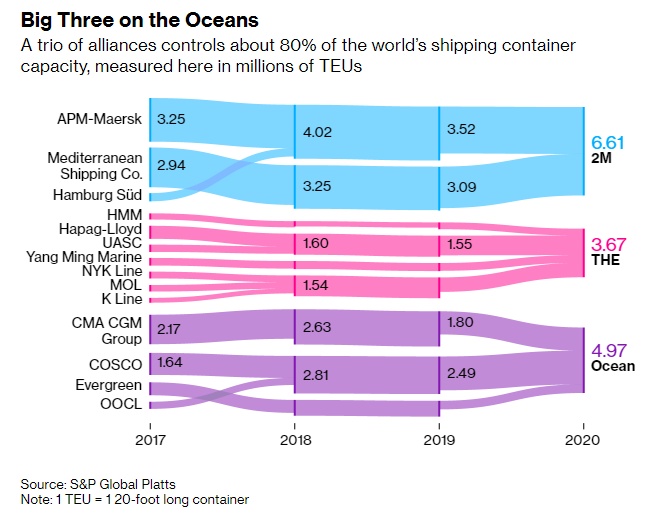 在集装箱行业,九家最大的公司集中在三个联盟中,共享船舶运力,Sea intelligence跟踪的这项服务的准时交付率徘徊在40%左右。这些公司在收取飙升费用的同时,也受到了来自政府的更大压力。