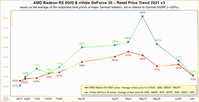 在以太坊挖矿的繁荣时期,矿工们将GPU价格推高至建议零售价的两倍以上。除了强劲的单位销售额,英伟达还能够通过制定高价提高利润率。但现在挖矿需求已经放缓,一些英伟达GPU的价格远低于建议零售价。英伟达GPU降价才刚刚开始,更糟糕的情况还在后面。