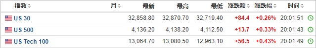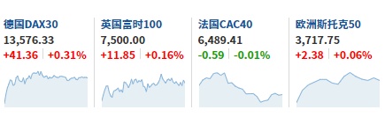 2. 截至发稿,德国DAX指数涨0.31%,英国富时100指数涨0.16%,法国CAC40指数跌0.01%,欧洲斯托克50指数跌0.06%。