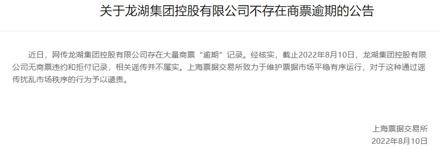 智通财经APP获悉,8月10日,上海票据交易所发布关于龙湖集团控股有限公司(龙湖集团,00960)不存在商票逾期的公告。公告显示,近日,网传龙湖集团控股有限公司存在大量商票“逾期”记录。经核实,截止2022年8月10日,龙湖集团控股有限公司无商票违约和拒付记录,相关谣传并不属实。上海票据交易所致力于维护票据市场平稳有序运行,对于这种通过谣传扰乱市场秩序的行为予以谴责。