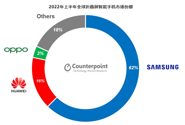 根据 Counterpoint 的折叠屏智能手机追踪器,2022年6月,三星在2022年上半年占据了折叠屏智能手机的主要市场份额,占总市场份额的62%;华为和OPPO分列第二和第三。