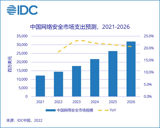 智通财经APP获悉,8月11日,IDC发布网络安全市场数据显示,2021年全球网络安全IT总投资规模为1687.7亿美元,并有望在2026年增至2875.7亿美元,五年复合增长率(CAGR)为11.3%。聚焦中国市场,2026年中国网络安全IT支出规模将达到318.6亿美元,全球占比约为11.1%,五年CAGR约为21.2%。中国网络安全市场增速持续领跑全球,五年CAGR近全球两倍,市场前景广阔。